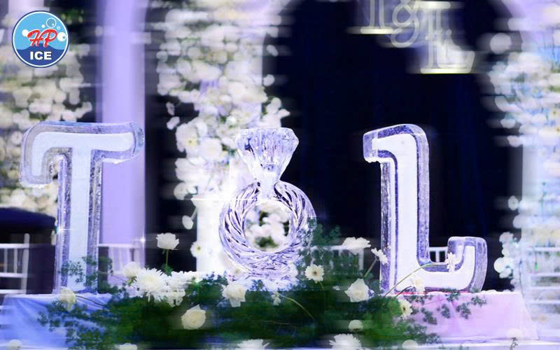 Ánh đèn phản chiếu qua khối băng trong suốt giúp không gian tiệc cưới trở nên lung linh, tinh khôi và lãng mạn hơn bao giờ hết.
